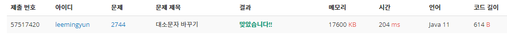 문자열 인덱스의 값이 대문자가 아닐 때 해당 값을 a에 저장해 준 뒤 문자열인 result에 대문자로 변경하여 더해줍니다.