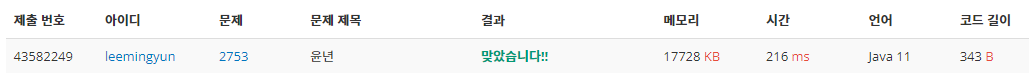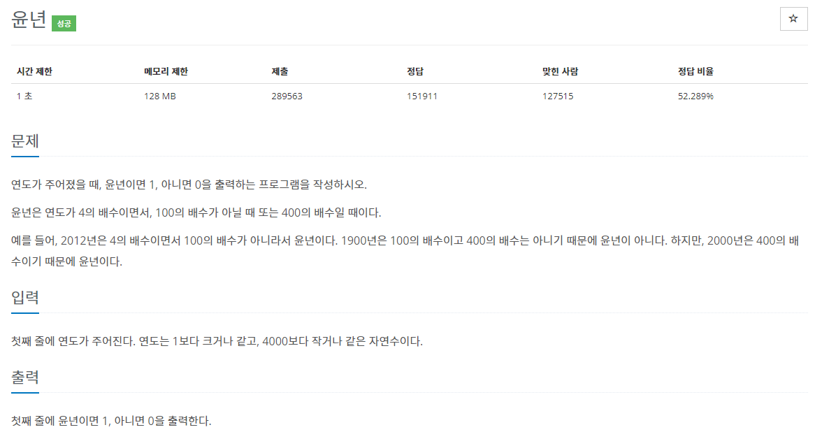 - 윤년의 조건이 만족할 때 1을 출력합니다.