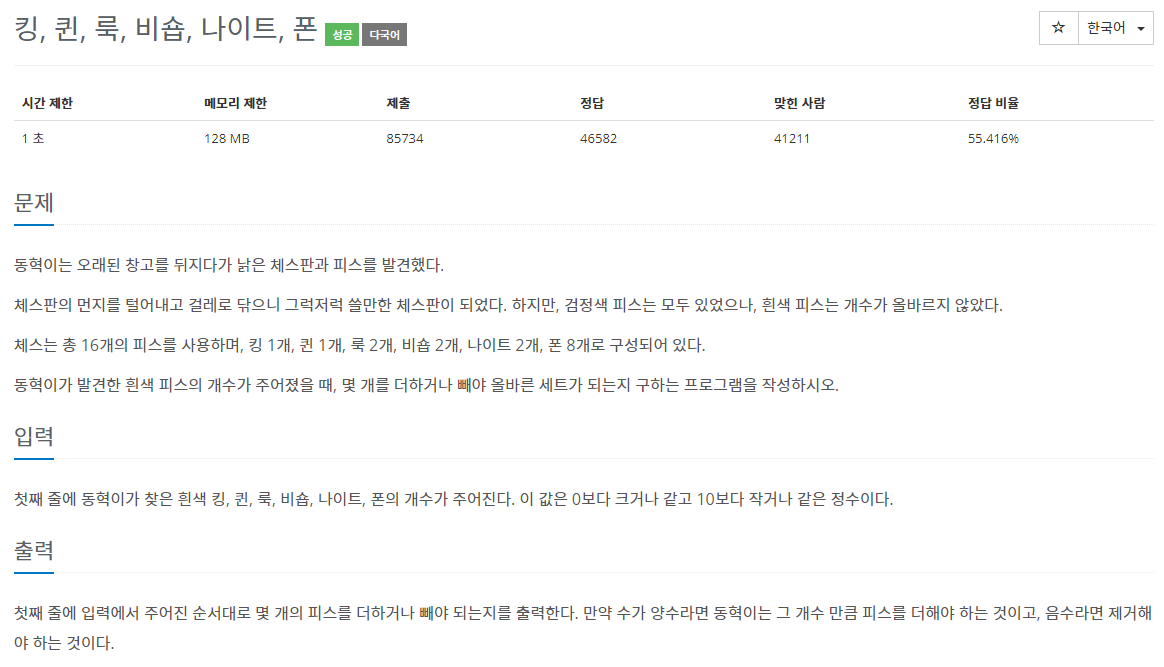 - 킹 1개, 퀸 1개, 룩 2개, 비숍 2개, 나이트 2개, 폰 8개와 차이나는 수를 출력합니다.