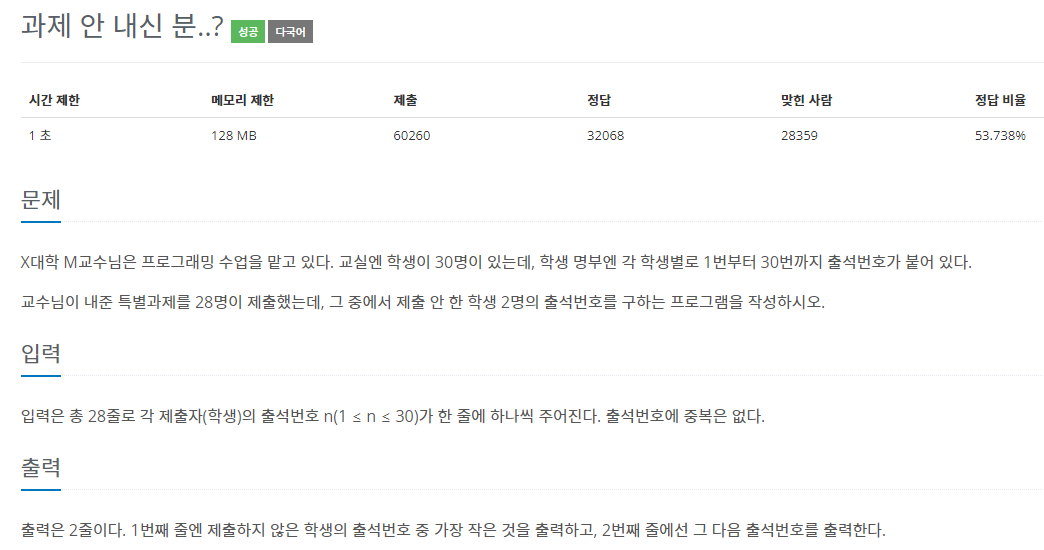 - 배열을 순회하며 값이 1로 초기화 되지 않은 인덱스 번호를 출력합니다.