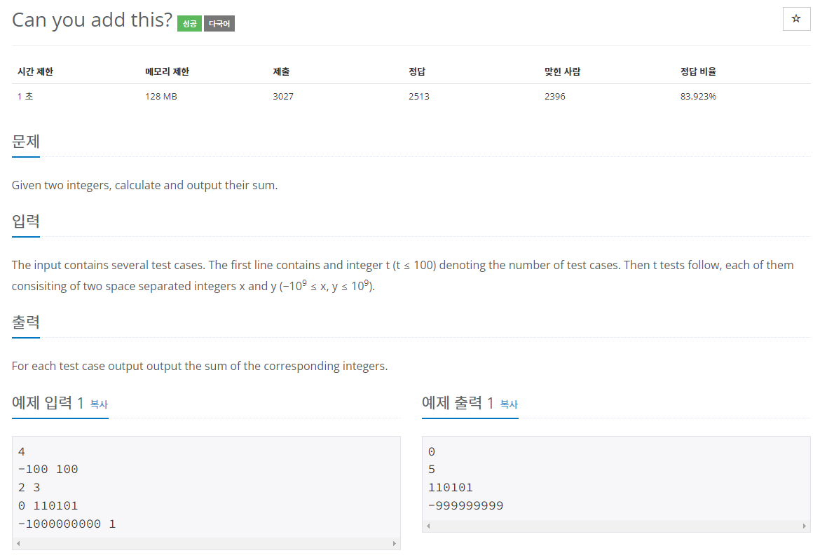 - 입력된 수만큼 두 수를 더하여주는 문제입니다.
