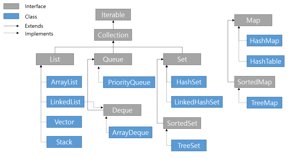 - 클래스 (Classes) : 컬렉션 별 인터페이스 구현 (Implementation). 목적에 따라 이미 구현된 컬렉션 클래스를 사용할 수 있습니다.
