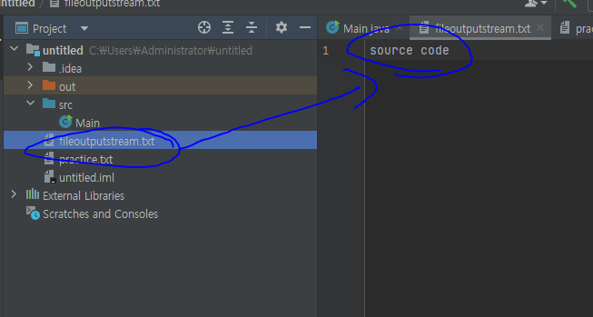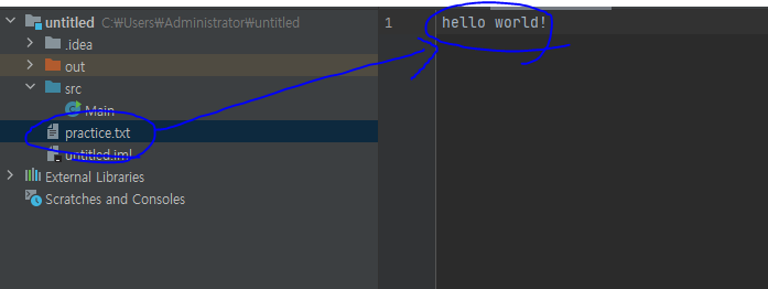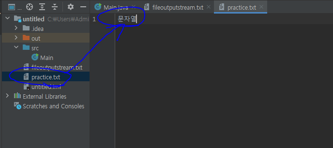 앞서 만든 practice.txt 파일에 문자열을 입력해 보도록 하겠습니다.
