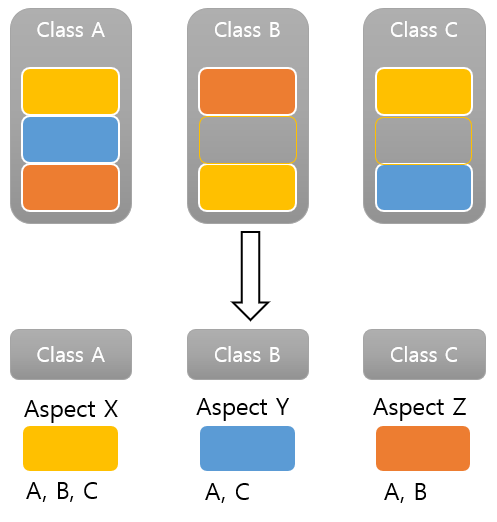 관점 지향은 쉽게 설명한다면, 어떤 로직을 기준으로 핵심적인 관점, 부가적인 관점으로 나누어서 보고 그 관점을 기준으로 각각 모듈화 하겠다는 것입니다.