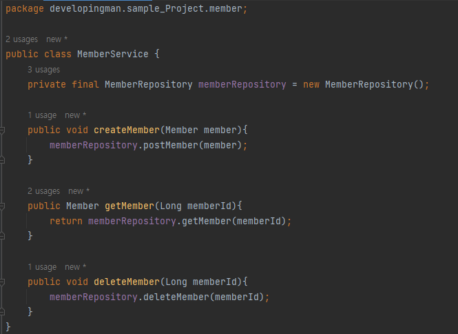 클래스에 구현된 세 메서드는 전부 MemberRepository 클래스로 구현한 객체를 통해 메서드를 사용하고 있습니다.