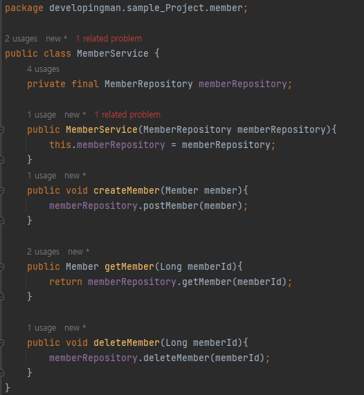 클래스에 구현된 세 메서드는 전부 MemberRepository 클래스로 구현한 객체를 통해 메서드를 사용하고 있습니다.