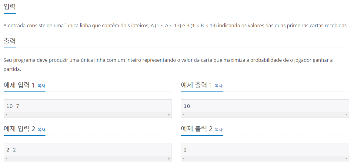 - 입력 받은 두 수가 같다면 같은 수를 출력하고, 한 수가 크다면 큰 수를 출력해주는 문제입니다.