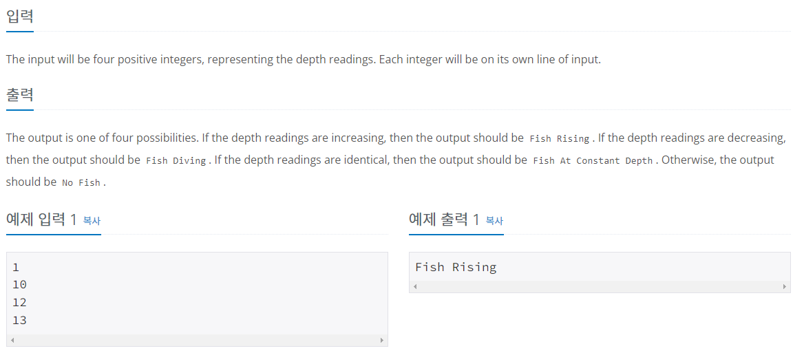 - 수가 계속해서 증가한다면 Fish Rising을 출력합니다