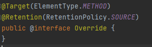 @Override의 소스 코드를 보면, 어노테이션을 정의할 때는 @interface 키워드를 사용하여 정의한 것을 확인할 수 있습니다.